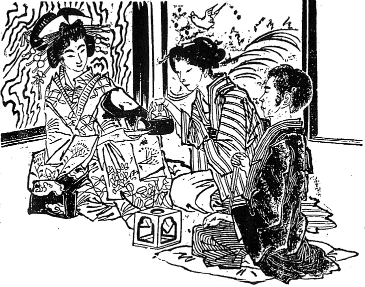 | 説明 | 養子の身でありながら放蕩して、家は身代限りになったという話の、挿絵はその傾城狂いの中の引きつけ――花魁(オイラン)との対面――の場面だろう。この男は京島原の角屋の八重雲太夫に入れ揚げた。島原では古風なしきたりに忠実で、花魁の仰々しい髪型やいわゆる「かしの式」などもおこなわれていたので、客の男も反り返って扇子を突いているなど、吉原の引きつけとはずいぶん様子がちがう。(大丸 弘) |