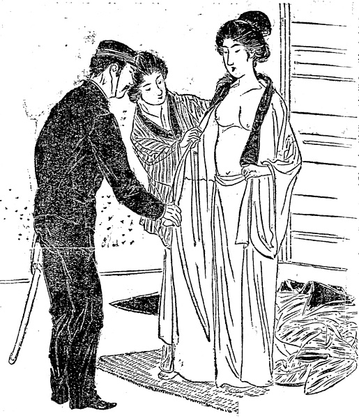 説明 〈遡及資料〉女囚が監房に入れられる前に女監洗場で「女監取締と看守とで来たりて巡査立ち会いの上先ず帯を解かせて衣類を一枚一枚脱がせ尚お湯もじまで取らせて身体を篤と取り調べ然して髪も解かせて櫛一枚の外はすべて取上げ(……)」という場面。きものは足もとに脱ぎ捨ててあり、女のいま脱ごうとしているのは白の長襦袢でたぶん黒の襟付き。長襦袢、湯文字(ユモジ)ともに白というのはこの時代ではめずらしい。頭は丸髷。(大丸 弘)
