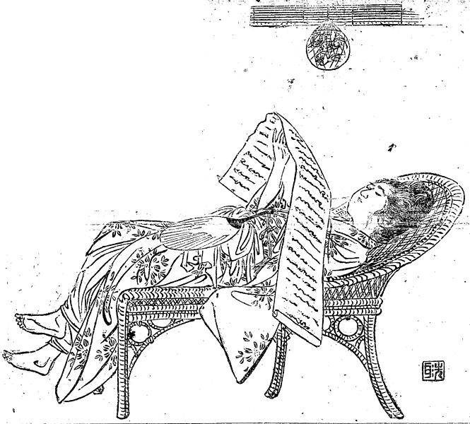 | 説明 | 〈遡及資料〉神経衰弱という口実で伊豆山温泉で休養しているおきん。いつもの手づくねの束髪が崩れかけ、巻紙の手紙を気に入らなそうな顔で読んでいる。顔の描き方に松本洗耳の悪い癖が出ている。あまり見かけないデザインの籐椅子だが、デッサンがかたく、やや不手際で、横たわっている女がいかにも苦しそうに見える。(大丸 弘) |