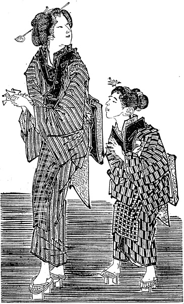 説明 大阪北の新地で席貸業を営むかたわら、自身は女髪結いをして父のいない家の一家五人の面倒を見ているという感心な娘の話だが、挿絵がそれにあまり一致していない。「此女子本年二十六才容色殊に衆に超えたりというにはあらざれど稍垢抜けのせし小綺麗な風貌(……)」とあるのはいいが、未婚だというのに眉を落としているのは不思議。結っているのはおそらく銀杏返しで前髪をごく小さくしているのはこの時代の傾向。髱(タボ=後ろ髪)に櫛を逆さまに挿しているのは髪結いのしるしで、これは客の髪を梳くためのもの。連れているのはおそらく梳き手の小女。(大丸 弘)
