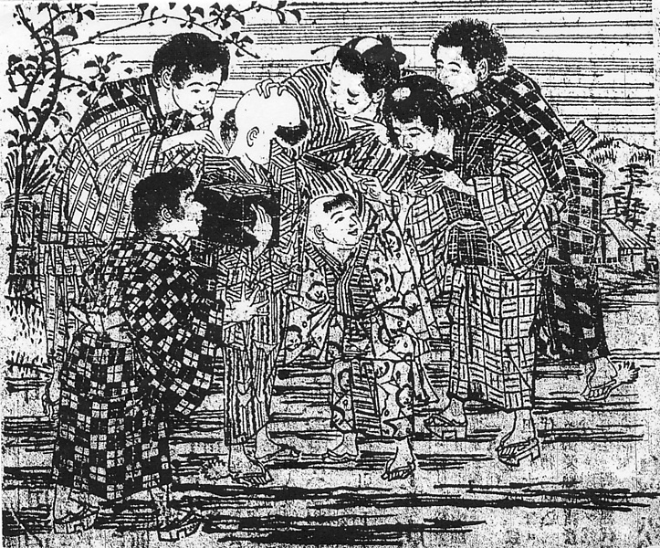 | 説明 | 記事の内容とはあまり関係のない挿絵。要するに父母とも急の病に臥してしまった幼い姉妹の話で、場所は堺。ガキ大将たちに取り囲まれているのが姉妹の中の数え十になる長女と七つの次女らしい。姉妹を含めてこの絵の中で参考になるのは子どもたちの頭の毛のスタイル。京阪では女の子はだいたい十歳くらいから髪を伸ばしはじめる。『守貞謾稿』(1837年~)に「今、京阪ノ童始メテ髪ヲ置キ、未ダ長ゼズシテ髻スルニ至ラザル者ヲ、ガッソウ天窓ト云、江戸ニテハ云ワズ」とある。(大丸 弘) |