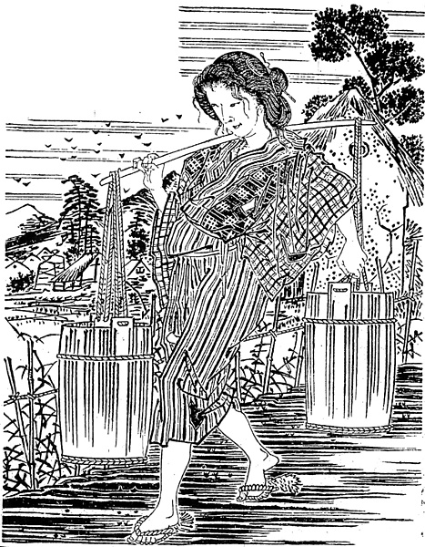 | キーワード | 農村;水桶;天秤棒;天秤担ぎ;竪縞のきもの;格子の別布;飛白の別布;細帯;ぞうり |