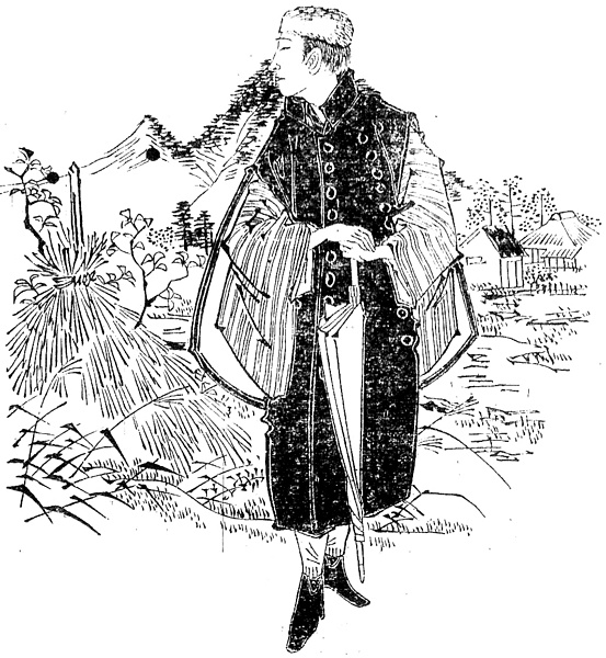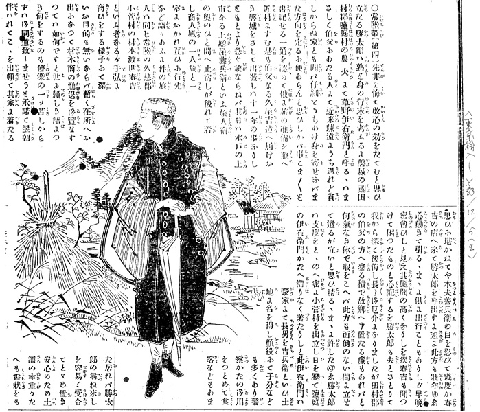 | 説明 | 記事と連載実録小説の中間で、一応『常陸帯』というタイトルがつけられている。地方の小商人の旅装束。この種の和装用の外套はデザインも一様でなく、なんと呼ぶかもはっきりしたことは言えない。形の似ていることからトンビという言い方が明治の前半期ではふつうだったようだ。田舎の人にしては、頭の猟虎帽(ラッコボウ)、短靴、蝙蝠傘と、かなり開化風の身なり。(大丸 弘) |
