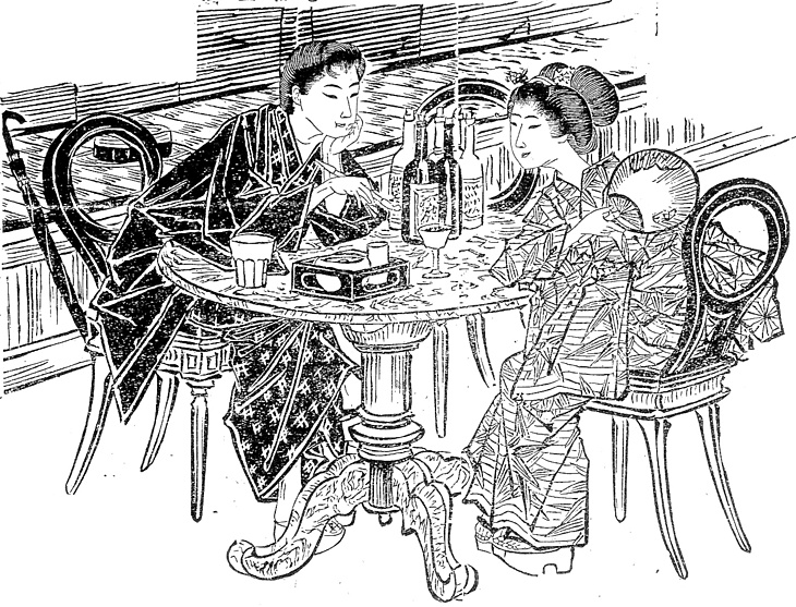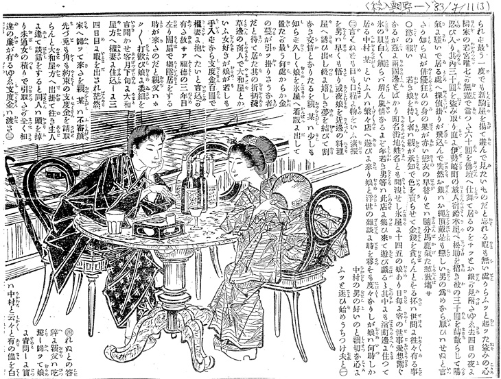 説明 両国辺の氷屋の、年は十四,五の看板娘。浅草辺の商人に、もし手入らずなら支度金百円で、という条件で妾に出したところ、未通女(オボコ)ではない廉がある、というので破談になった。挿絵は娘がまだ店で稼いでいた頃の、恋人との逢瀬の情景。娘の髪はたぶん唐人髷。前髪がひどく小さいのは幕末以来の風。髷が大きいのは娼婦などにはあることだが、この娘の場合は、年齢を考えれば、子どもらしさの強調か。ふたりとも前が斜めのノメリのある駒下駄を履いているが、ノメリ型は明治以後にはあまり好まれなくなる。氷屋とはいうものの、安物とも見えない舶来風のイスやテーブルがあって、大正・昭和の氷屋とはべつのイメージがあるようだ。(大丸 弘)