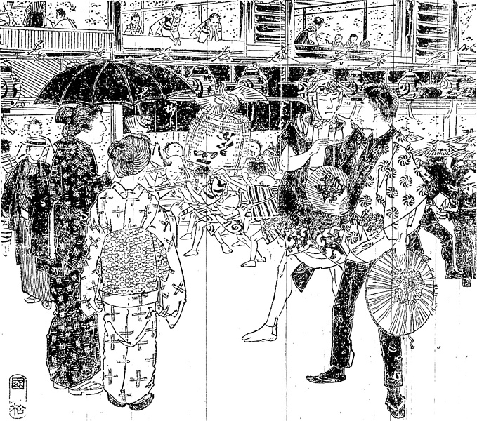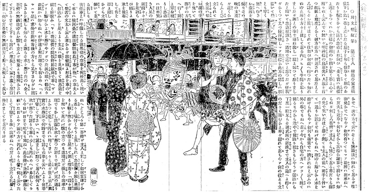 説明 〈遡及資料〉挿絵とこの日の本文とは関係ない。東京下町の祭礼の有様。向こうには子どもらの担ぐ樽御輿が見える。ふたりの男は派手な祭の衣裳。たいていはその年その年に新調する町内の揃いの法被や浴衣で、祭りが済めば着られないような派手な柄が多かったから、貧乏人にはけっこうな費えだった。右側の、花笠を手にした紺の腹掛股引の男は、町の名入りの掛け襟のある巴柄の半纏。左側の頬被り、足袋はだしの、丸団扇を持った男は、荒磯柄の浴衣を尻からげして、新しく剪った、真っ白な晒しの褌(フンドシ)の前を大きく見せている。左隅、蝙蝠傘を差すヒロインの母親は、四十という年相応の低い丸髷を結い、紺絣のきものに帯は結び下げ。まだ肩揚げのある娘は銀杏返しに結って、帯は角出し風。(大丸 弘)