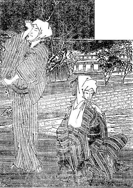| キーワード | 頬被り;頬かぶり;竪縞のきもの;吹き流し;潰し島田;つぶし島田;湯文字(ゆもじ);袖に手を隠す;抜き入れ手;立て膝 |