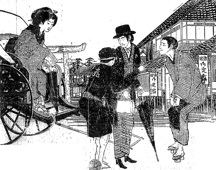 | 説明 | 話の中身はひどくややこしいが、そういうこととは関係なく、舞台は東海道藤沢宿の大鳥居近く、旅籠の並んだ道筋。人力の上の女は東京の芸者で、髪は前からでははっきりしないが唐人髷のように見える。細かい縞のきもので裾を少し端折り、草鞋を履いているので、一応は旅装束。宿の客引きと車夫の間にいる連れの男は、きものの下に襟の詰まったシャツを着、黒い帽子にたぶん革製の四角い鞄、蝙蝠傘に靴、という姿は開化の事業家風。なお、車夫が股引も穿かず裸足でいるのは街道筋だからで、東京府内では許されない恰好。(大丸 弘) |