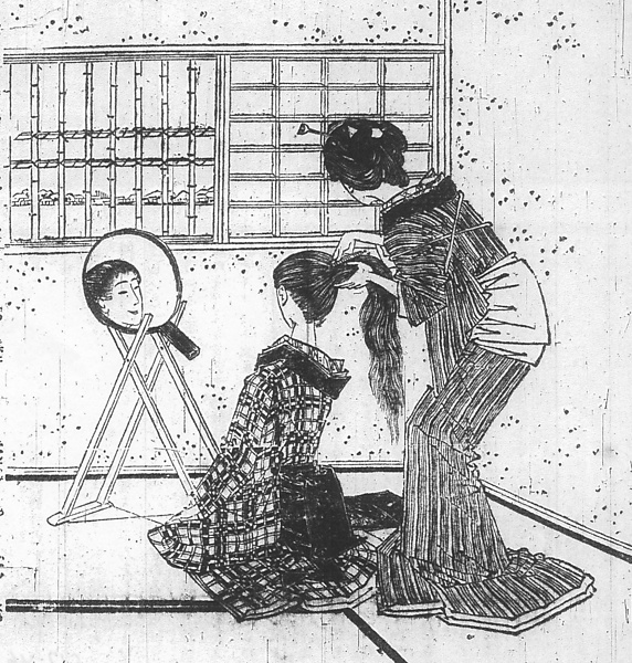 | キーワード | 髪結い;格子のきもの;竪縞のきもの;黒襟;襷掛け;曳き裾;後ろ姿;背面;髪を梳く;梳き櫛;鏡 |