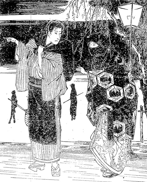 | 説明 | 寄席がはねたあとの遅い時間に、銀座の鉄道馬車道を話しながら行く男女。男は元士族で、いまはスッカリ商人になりきっている。縞のきものに大きな前垂れ、白足袋に、白い鼻緒の畳表の堂島下駄。大店の奉公人は、一冬に五,六足の白足袋を与えられるが、鼻緒の色が足袋にうつりやすいので、多くは白い鼻緒の下駄にする。しかし、そうすると坊主くさいと言って、嫌がる者もあった。女の方はお高祖(コソ)頭巾を覆面のように被って口もとを覆っている。まるで山岡頭巾のよう。いままで寄席の舞台に出ていた女浄瑠璃語りなので、顔を見られたくないため。「濃茶縮緬の一つ紋の羽織の上に綿南部の荒い縞の寝子(ネンネコ)半纏を引きずるばかりに着たり」とあるが、ねんねこの柄が挿絵ではちがっている。(大丸 弘) |