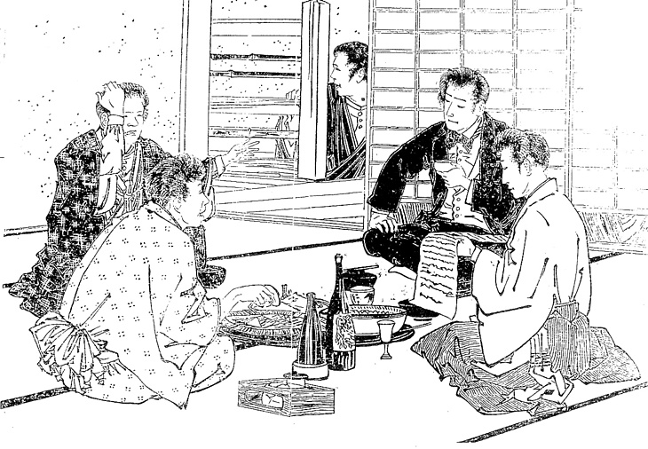 | 説明 | 神戸の割烹店の奥座敷で、これから沖縄へ就職して旅立つ友人を送る送別会。文では大一座となっているが、挿絵では四,五人に手を省いている。この時代の若い男性の散髪には、ほぼ共通する好みがあるらしく、もみあげは長く、前をやや伸ばし気味にして上にかき上げているスタイルが多い。絣のきものに兵児帯を無造作に締めた男もあれば、無地のきものに袴を着け一応礼を表しているようで、その袴に手拭いをぶら下げている男もあって、いかにも書生の一座らしい。一人、洋服姿が今日送られる主賓だろうが、入り口に近い下座にいるのは構図上やむを得なかったのか。(大丸 弘) |