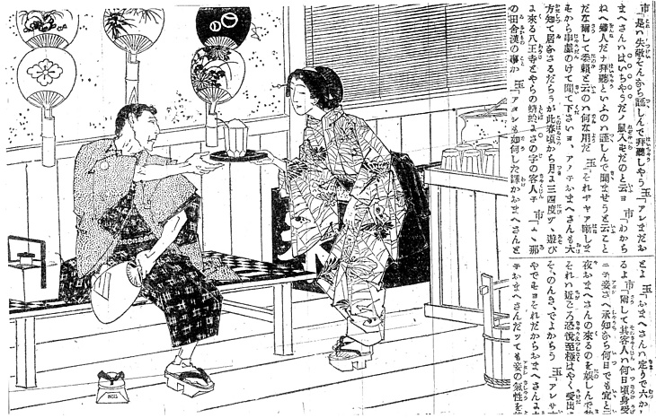 説明 氷店の客と給仕の女。客の男は薩摩絣風のきものに博多の帯、小紋の紋付羽織で、夏だというのに白足袋に堂島風の下駄、という決まった身なりの田舎大尽。なんとなく品がないのは、ひとつには縁台に座る人がよくやる片脚を上げたあぐらのせいもあり、新井芳宗のマンガチックな絵柄のせいもあるだろう。かき氷は、開化の庶民の食べ物の中では人気のあったもので、葦簀張り(ヨシズバリ)に氷と染め出した小旗を出した氷店は、昭和三十年代くらいまでも続いた夏の風物詩だった。足元が板敷きになっているのは、絵師がわざと芝居がかりに描いたもので、当時の人の芝居好きに迎合したもの。(大丸 弘)
