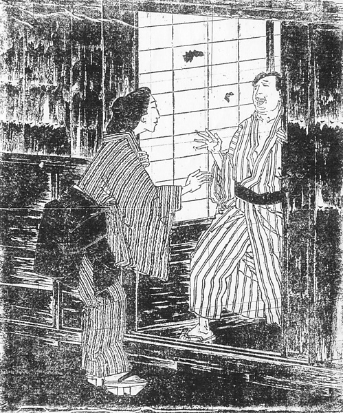 | 説明 | 廓(クルワ)から請け出してくれた男のもとから逃れて、府中から本郷まで車を走らせ、真夜中にべつのなじみ客の下宿にたどり着いた女。女の髪は銀杏返しだろうが、この髪はスタイルのヴァラエティが広く、こういったタイプの髪型ではっきりしない場合はまず銀杏返しと考えてよい。引っ掛け結びの帯をごく低く尻の辺りで結んでいるのは、必ずしも娼妓上がりの女だから、と取る必要はない。女の横顔の鼻の低さを見ると、この時代、絵師があまり女の鼻の高低に関心のなかったことがわかる。(大丸 弘) |