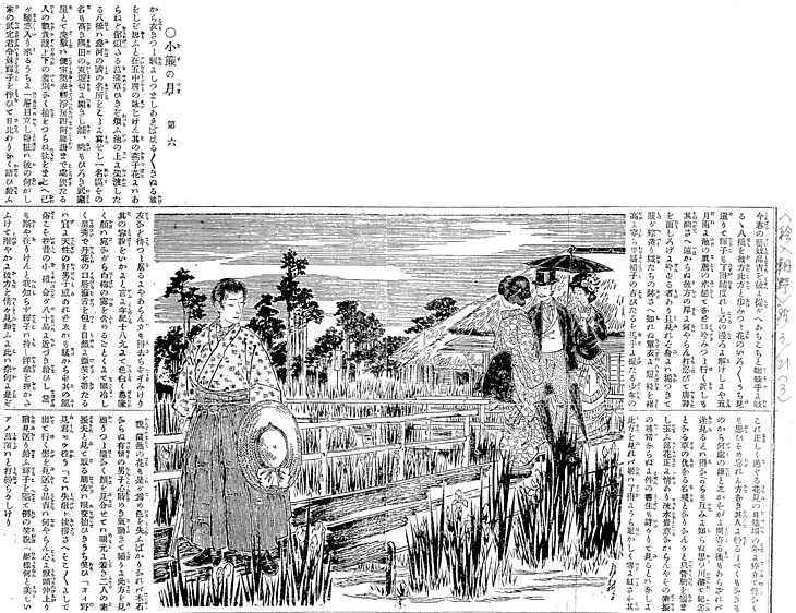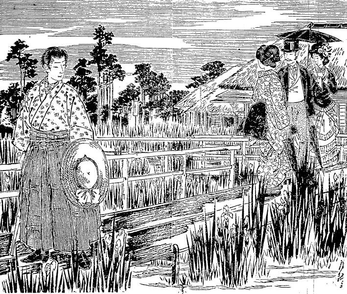 | 説明 | 堀切の菖蒲園は、その当時東京市内では名高い行楽地だった。三河に模した八つ橋の上での美男美女の出会い。なにがし家、とあるのはおそらく華族なのだろうが、こんな行楽でも当主は燕尾服の礼装。その妹は洋装で、細部はわからないが1880年代中期の、当時の欧米のファッションとそれほど目立ったちがいはないようだ。一方、青年の方は、「年紀十八九にて色白く鼻隆く顔はさながら白梅の露を含めるごとく眼涼しく眉秀で丹花の口唇蘇舌を包み自然に微笑を帯たるはげに天性の好男子威あれどしかも猛からず(……)」と、男性の描写としては意を尽くしている。青年が、絣のきものの下のシャツに蝶ネクタイを締めているのはめずらしい。この「和装で台襟、袖口にカフスのあるワイシャツ、靴ばき」という恰好はいかにも明治的で、ただし1890年代末(明治20年代末)になると滅多に見られなくなる。(大丸 弘) |