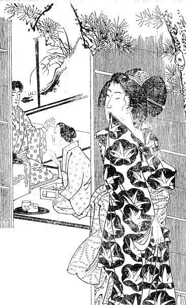 | 説明 | 手前に立っているのは下宿屋の娘。思い焦がれている客が郷里からの呼び出しで去ってゆくのを悲しんでいるさま。客の男は手元に大きな鞄と帽子を置いていて、すでに出発の支度もできている様子。娘が袖先を口にくわえているのは哀しみや悔しさを表す仕方。縮緬の絞りのやわらかい帯を巻き裾を引き上げている。明治十年代は、家の中でまだ裾を曳いている人がけっこういたのである。(大丸 弘) |