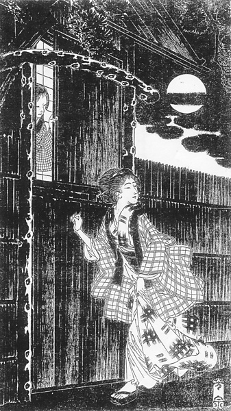 説明 娘は、家では曳いている裾の前づまを、片一方の手で荒っぽく掴んで引きあげている。蛎殻町の日の出の商人の養女でなに不自由ないお嬢さまだが、取引先の毛唐人の妾にしようという養父の意図がわかって驚愕し、夜更けに育ての親の老夫婦の元に逃げ出してきた。