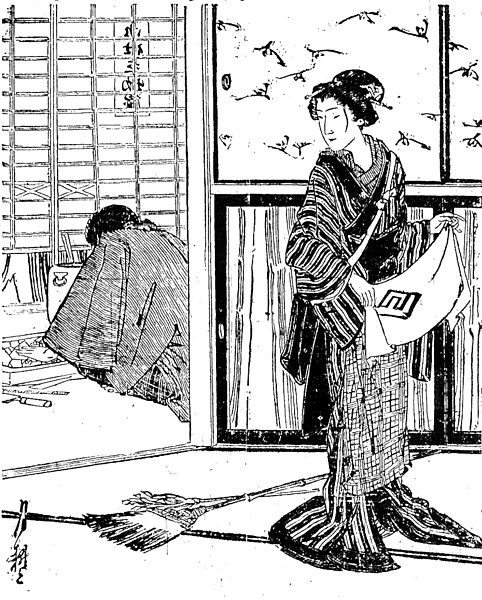 | 説明 | 仕立職人の夫の仕事場を見返りながら、これから掃除にかかるため手拭いを被ろうとしている女房。職人の左に物差しと、大きな包丁の柄の部分とが見える。この時代は布地の裁断には鋏でなく裁ち包丁(タチボウチョウ)を使うのがふつう。仕立職人のいちばん腕のいい連中は、たいていは名のある呉服屋の抱え職人だったらしい。職人の女房だが、この時代、まだ掃除でも裾を曳いている。家庭でのふつうの家事、というより家にいるときは、右袖の袂だけを引き上げる片襷がふつう。帯はおそらく下げ結びで、その下に前垂れをしている。(大丸 弘) |
