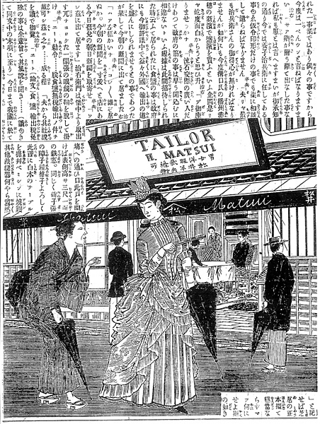 | 説明 | この日の本文には、挿絵に見えている洋服店の内部の詳細な説明が、舞台装置の解説の心で記されている。それに準じて店の前の女性の描写も芝居がかり。「物好みせし洋装の一個の女が(……)甲斐絹張りの蝙蝠傘に片手を掛け萎めし骨が冠れる帽子にチョッとさわれば、アアこころ悪る、と身を縮めて目を細めたる愛嬌は応挙源喜の美人画も一時に非職になりそうな別嬪(……)」。この女性がヒロインの芸妓。この前年の1月、京都・島原に束髪・洋装の花魁(オイラン)が現れたという、この時期の風潮がわかる。(大丸 弘) |