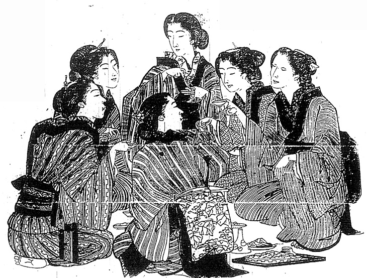 | 説明 | 大阪・安治川辺りの裏通りに巣喰っている、外国人相手の洋妾(ラシャメン)たち。神戸・大阪の港を根城にしている欧米人の船乗りたちや、中国人が客。大阪の下層の女性の帯は下げ結びが多かった。結び端が畳に垂れているのがそれ。六人中、束髪とはっきり知れる女性が二人いて、流行の広がりの早さがわかる。すべての女性が黒い襟付きで、半襟を首筋に被るまで引き出している。(大丸 弘) |