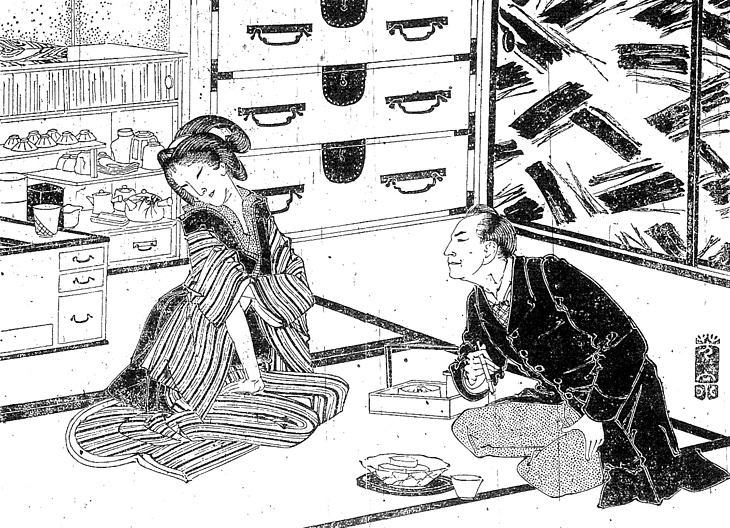 | キーワード | フロックコート;腕まくり;竪縞のきもの;襖(ふすま);箪笥(たんす);茶箪笥(ちゃだんす);煙草盆;長火鉢;つぶし島田 |