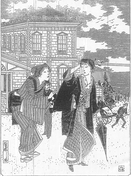 説明 汐留の東京駅を後に見た二人の女性。右は小説も書こうというインテリ開化の女で、前髪を垂らした束髪に大きな花簪(カンザシ)。蝙蝠傘を突き、小さな靴を履く。後ろの、眉を落とした下町風の女は、前髪はやや突き出ているがぐっと低い丸髷で、襟をあまり抜いていないので髱(タボ=後ろ髪)が襟に付きそう。一体にこの時代の素人の女性は襟はあまり抜かず、胸を低く押し広げ、半襟を幅広く見せる方がふつう。褄を少し引き上げて帯に挟み、帯は腰骨の辺りで柳風に結び垂れて、白足袋に畳表の付いた小町風の下駄。(大丸 弘)