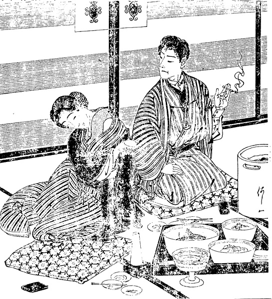 | 説明 | 芸者上がりの人妻が、夫と別れてもう一度商売をしようかどうかという相談を、気を許した男に持ちかけている情景。女性の方は触れなば落ちん風情だが男の方は冷ややか。女の夫はかなりの地位にあるらしく、そのためか女は前髪を切った束髪。そのことについて、「是でも亦人形にも衣装ですから出ればちっとは美麗(キレイ)になりまさアナ」「夫れまでに前髪が延びるかナ」「オホヽヽヽヽ髪は延びもの身は大事ですが古い言い草ですネエ」といったやりとりがある。もちろん芸者島田は切前髪では結えない。(大丸 弘) |