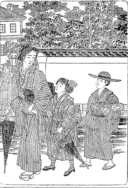 | 説明 | 大阪の中心部の豊かな商人の女房と、女学校に通っている十四になる娘の外出姿の衣裳付け――「お徳は髪を丸髷に結い、金台に水晶の簪(カンザシ)を挿し、銀蒔絵せる牡丹形の櫛を挿し、捻上布の帷子に繻珍の帯を締め、お俊は髪を引詰めの束髪に結い鼠地の絽に花の丸を大きく所々に友禅に染めたる帷子に、おなじく水色の絽の下襲を裾短かに着て、銀鼠地に赤色を交えし靴下を長く穿ち、古金襴の帯を小さく結びたる(……)」。後ろに従っているのはお供の丁稚で、たぶん今日だけの袂のあるきものを着せられ、お土産を入れた風呂敷包みを抱え、鍔(ツバ)の大きな麦藁帽を被っている。(大丸 弘) |