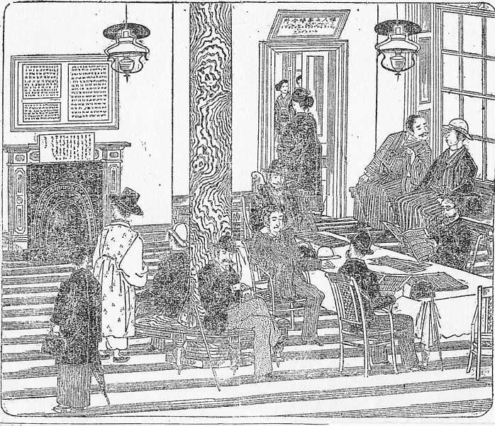 | 説明 | 大阪・梅田ステーションの、上中等乗合待合所。午前8時25分発の神戸行きの汽車を待つ人々。鉄道の等級は最初からあったが、1897(明治30)年以前は一等(白切符)、二等(青切符)、三等(赤切符)の区別ではなく、上等、中等、下等という言い方。運賃はほぼ3:2:1の比率で、車内の設備のみならず、こうした待合所にも区別があった。右側の扉上の掲示を見ると、婦人上等待合所とあるので、女性はさらに優遇されていたことがわかる。なお、大きな駅には、別に切符を買わずに乗車する人物のための貴賓室があり、これは現在も少数残っている。この部屋の天井からは、わりあい素朴なランプが吊されている。図中、洋装の男性はすべて高帽、あるいはヘルメット風の帽子を被り、三人の和装男性のうち帽子を被っているのは一人だけ。(大丸 弘) |