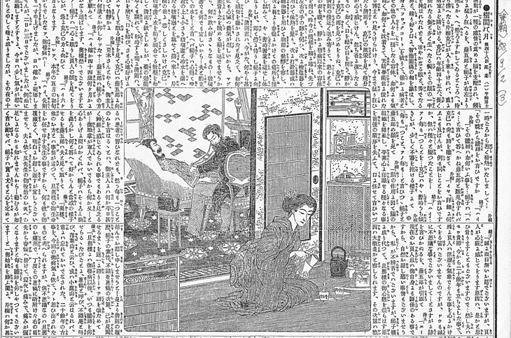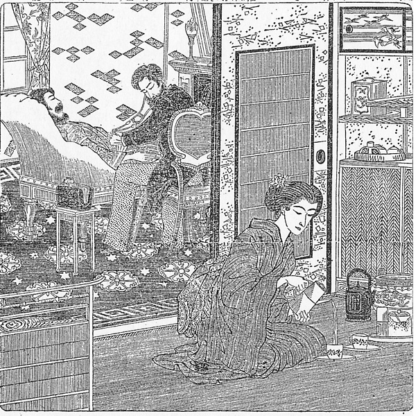 | 説明 | 往診に訪れた医師の診察中、次の間で患者の妻がもてなしのお茶を煎れている。政府高官で豊かな家というだけでなく、この時代としてはずいぶん洋風化の進んだ室内の設え。とはいえこの時代の洋風化には、半世紀後の生活的洋風化とはちがう独特さがある。各部屋は畳でもフローリングでもなく、カーペットが敷き詰められている。部屋の境は和風の襖、壁には床脇風の棚があり、奥様はお茶の接待をするのに敷物の上にぺったり座って、敷物の上にじかに置いたコーヒーカップに湯を注いでいる。背中に痛みを訴えている患者は、ベッドではなく西洋人式にソファに凭(モタ)れている。そのソファ、椅子などは装飾の過剰さと安っぽさのふしぎに混交した民衆的ヴィクトリアンスタイル。奥様の髪は下げ巻風の束髪だが、ほぼ中央で分けているのはこの時代ではめずらしい。(大丸 弘) |
