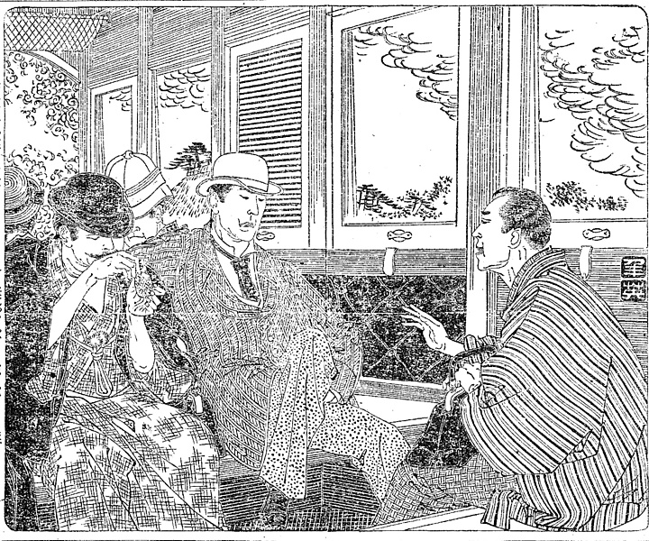 説明 上野発仙台行きの列車内の乗客たち。「機関車に伴われてる十五六車」とあるように、この時代は一台の車体が短かったため、十両以上の連結がふつうだった。挿絵の人物と本文の説明にかなりの違いがあり、手前の三人のうち真ん中の人物も、「黒の上衣白の胸衣(チョッキ)縞のズボン」の二十二,三の壮士とあって、画家はなにを思っていたのかわからない。この若者は先月の磐梯山噴火の取材に派遣された新聞記者で、一般には種取りなどといわれ、あまり敬意を払われた職業ではないが、それでもYシャツの襟は硬い竪襟で、ホンブルグ風の中山高を被っている。その隣は「官員体の鷹揚なる人物鼻の下の髯を捻りあげながら」とある一方で、冒頭では「洋服にして髭を蓄えたるは官員なるべく」と言っている。挿絵では羽織姿のこの男は、パイプに粉煙草を詰めている様子。(大丸 弘)