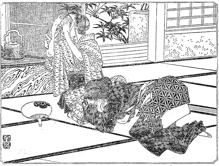 キーワード 手ぬぐいで顔を覆う;手水鉢(ちょうずばち);廊下;障子;簀戸(すど);簾戸(すど);葦戸(よしど);薬缶(やかん);うちわ