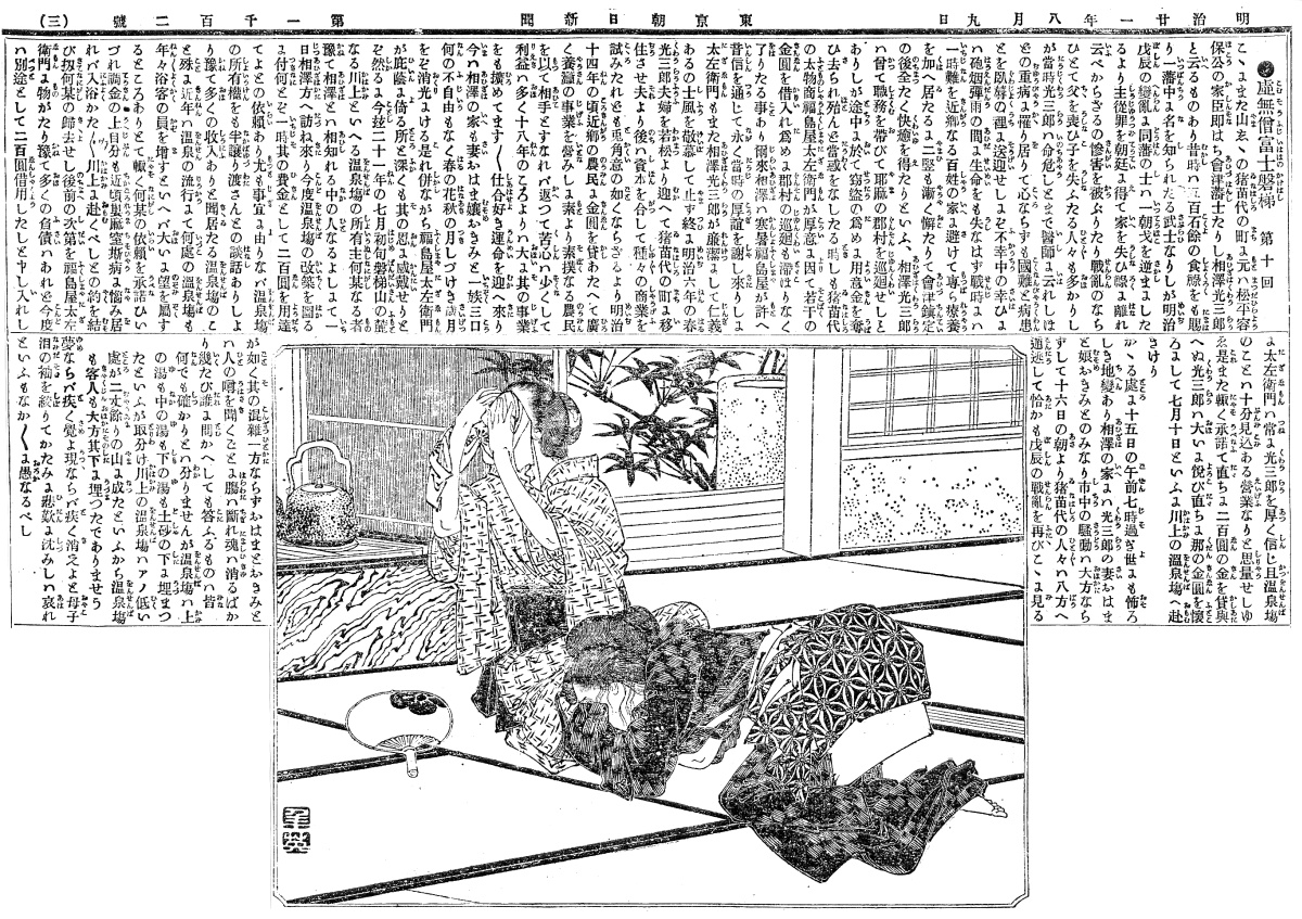 説明 1888(明治21)年7月に磐梯山が噴火し、たまたま温泉場開発のためにその麓の村落に滞在中の一行が生き埋めになる。父親の遭難の知らせを聞いて、母娘は「夢ならば疾く覚めよ現(ウツツ)ならば疾く消えよと母子涙の袖を絞りて(……)悲嘆に沈み」という有様。二十年前までは会津藩士として五百石どりの家格、その旧士族の妻と娘としては泣き様がやや大仰――と、むしろこの時代の人なら思うにちがいない。女性が声を上げて泣くようなときは、この娘のようなポーズになることが多い。小柄な当時の女性には相対的に帯のボリュームが大きかったから、畳に伏して尻を持ち上げるような恰好では、臀部が山のようになる。女性が泣くときはあふれる涙や鼻水を受けるために、ふつうは襦袢の袖口を引き出した。ハンカチをつかうようになるのはもうすこし後の時代で、それも女学生など若い女性から。男は外出の折にはたいていふところに手拭をもっているので、これを使うが、この母親のように女性が手拭をつかう例はめずらしい。(大丸 弘)