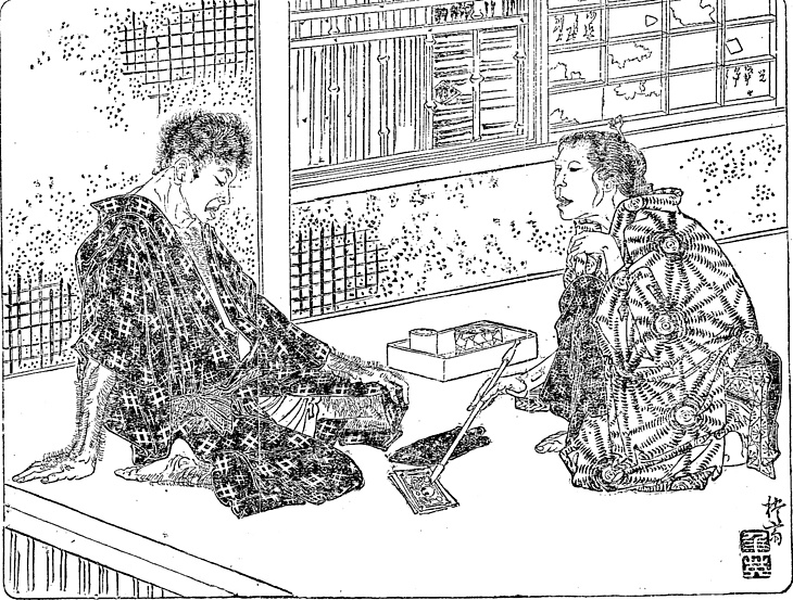 キーワード 飛白のきもの;逃げ腰;十円札;総柄のきもの;長煙管(きせる);煙草盆;毛筋を挿す;立て膝;素足;破れ障子;土壁