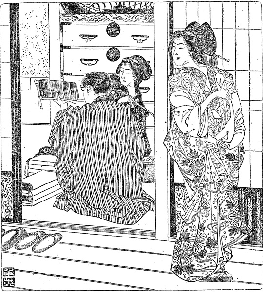 説明 廓(クルワ)に呼ばれた呉服屋の番頭が、盗品と思われる反物の値踏みをしているところ。廊下に立って中の様子を窺っているのは花魁(オイラン)で、独特の兵庫髷の根の辺りに長い笄を挿し、派手な柄の裲襠の前を押さえて着ている。肩に掛かった裲襠(ウチカケ)の掛け襟は思いきって幅の広い絞り柄、その下の赤い長襦袢の襟も広く見える。縞のきものを着た番頭の向こう側は、ここでは青衣と書かれている新造。(大丸 弘)