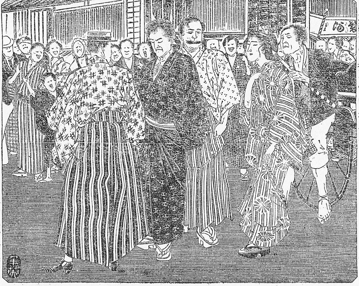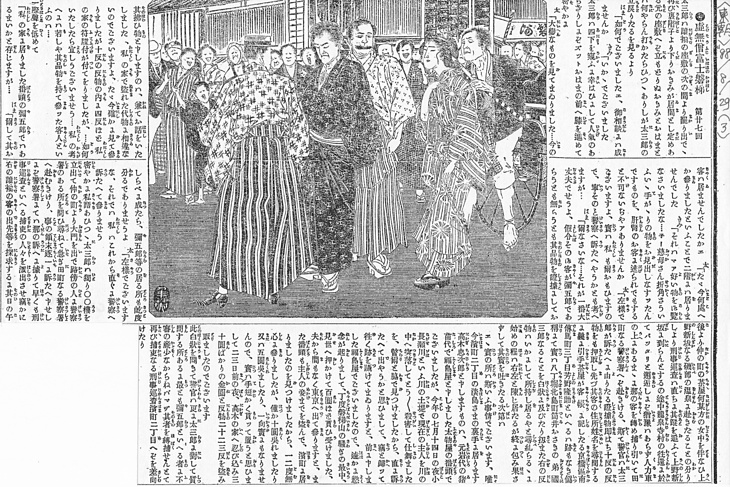 | 説明 | 中の町の茶屋の女中を連れて温泉に向かう犯人を、二人の刑事巡査が前後から迫って逮捕、という場面。本文では「人力車(クルマ)の上にあるままに絡め捕り」とあるが、すこしちがっている。襟元を押さえ、小褄をすこし引きあげているのが連れの女中だろう。犯人は車夫で、ひどく毛深いことによってこの種の身分の人々への、ある種の差別を画家は示しているらしい。この日の挿絵でも苦労して胸毛を見せている。犯人、背後の刑事、茶屋の女中の三人はノメリの下駄。ノメリの表付きは明治時代には非常に好まれている。刑事のひとりは靴履き。刑事という呼称はようやくこの頃一般化したが、それまでは探偵とよぶのがふつうで、江戸時代の下ッ引きのように嫌われていたフシがある。それでこの時代、刑事巡査はかならず袴着用のこと、という指示が出ていた。(大丸 弘) |