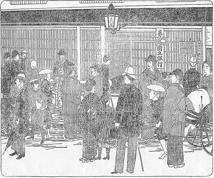 | 説明 | 文中の話題から、市中の銀行前の人通りを描いている。ガスの軒灯こそあるが、この時代の国立銀行がまだ格子作りの木造家屋であったことがわかる。しかし屋内は木の床に立ち机を並べて、イスに坐っての執務になっていたろう。通行人の姿で特徴的なのは、男性がひとりの坊主頭を除けば皆なにかの冠り物をかぶっていること。これは和装洋装に関係ない。この時代は中折帽よりも、中山高帽が好まれた。またヘルメットを冠っているひとがふたりいる。pith helmet あるいは topee とよばれる防暑帽は、イギリス、フランスのアフリカ、インド方面への勢力伸長に伴う欧米の世紀末の流行だった。わが国でもそれを真似て軍隊や警察で採用した時期があり、民間でもまたそれを真似る人があったが、あまり長続きしていない。手前中央の少女を伴った女性は、髪を束髪にしてネットをかけている。右端人力車上の女性はわからないが、日本髪の女性が一人もいないことでも、この時代、束髪熱がまだ衰えていなかったことが察せられる。(大丸 弘) |
