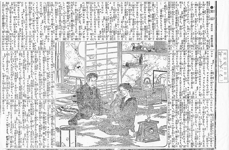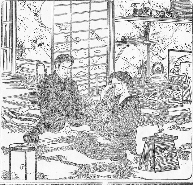 | 説明 | 貧と福とを対照的に描いてゆく物語のなかで、このふたつの情景は車夫の貧乏所帯を描写している。とはいえ女房が手内職をし、十四,五の娘がもう茶屋勤めをしているといえば、極貧という暮らしではない。剥げ落ちた土壁に破れ障子、見るかぎりでは長火鉢に小屏風、紙屑入れと燭台の台を兼ねた踏台と、古風な行灯式のランプがひとつ、ほかに家具らしいのはふたつの画面からは見えないが、おそらくそんなものだろう。物入れの代わりになっているのは吊棚で、食器や瓶、なにか行李めいたものや枕までが載せてある。手拭いの吊してある竹竿には乏しい衣類も引っ掛けておける。「娘は母の姿の異様なるを見て、すこし眉を顰(シカ)め」とあるのは、母親が父親の半纏一枚の上に前掛けをしているため。母親のいうのには、質屋から袷を請け出してきたいのだが、その代わりに預けるはずの単衣を洗濯しようと、まだ手桶のなかだという。汗のついたままと洗ったものとでは、質の値がちがうのだ。いま着ている半纏と単衣を持っていけば、それで袷が請け出せる――といったやりくりが、この階層の人々の衣生活だ。(大丸 弘) |