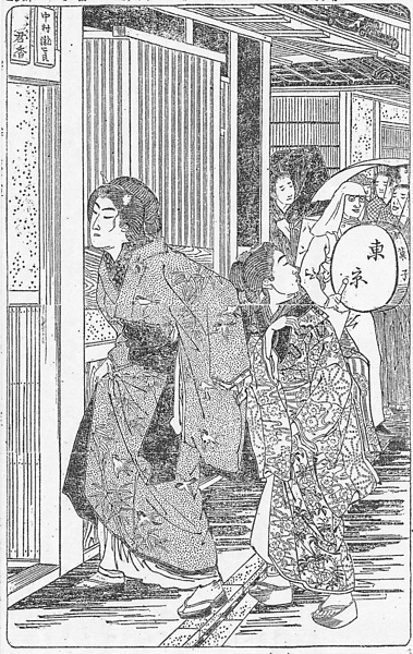 | 説明 | 胸にいろいろと心配事を抱えて、男の隠れている朋輩芸者の家に駈けこむ芸者。雛妓(オシャク)を一緒に連れている。手に三味線を持つようなときではないから、女は右の手でむんずと褄を引きあげて赤い長襦袢の下の白い湯文字(ユモジ)を見せ、左手は懐手して肘を張っている。こういう恰好はいかにも芸者風の凄みがある。髪はもちろん芸者島田、履いている下駄はノメリの塗り下駄で小町型という。雛妓の履いているのはぽっくり。画面の後に横丁から出てきたパン屋が見える。大きな太鼓を叩いているので弘め屋のようでもあるが、背中に荷をしょっているので、宣伝販売か。(大丸 弘) |