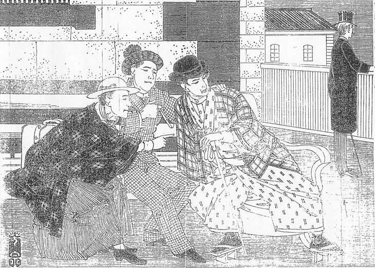 | 説明 | 新橋駅から汽車に乗り込んだ美女を見かけ、そのあとを慕ってこれから同じ汽車に乗り込もうという若者たち。いずれ金に不自由のない遊民と思われるが、身に着けているものは念入りに不統一で、そこに作者なり画家の二代目歌川芳宗なりの意図があるのだろうか。中央の男の被っている帽子は毛糸で編んであるらしく、てっぺんにポンポンが見える。右の男の帽子がいちばん値の張るホンブルグか。しかし、その彼はいちばん経済的な、差し歯の高下駄を履いている。朴の木を使うので朴歯の下駄といわれる差し歯の高下駄は、この時代から若い人に愛用されるようになっている。(大丸 弘) |