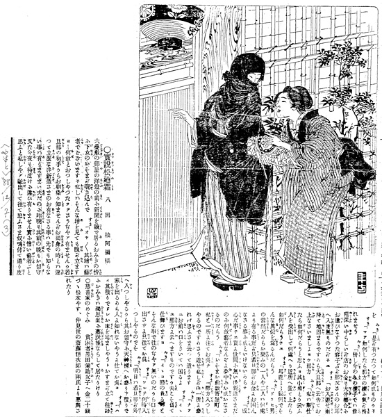 | 説明 | 挿絵は本文の中身を先走りして、若妻が女中を伴って、夫が夢中になっている芸者の数寄屋町の家の門口を訪れたところ。頭巾で顔を隠した妻はたぶん黒の羽織に黒繻子の帯を締め、袘(フキ)の厚く出たきものを二枚重ねて、後丸(アトマル)の黒塗りの下駄。芸者屋らしく御神灯の下がっている玄関を指さしている。下女は襟付きの縞のきものに前垂れ、若い娘らしくきれいな半襟を見せ、襟の打ち合わせは浅くして、帯を低く結んでいる。(大丸 弘) |