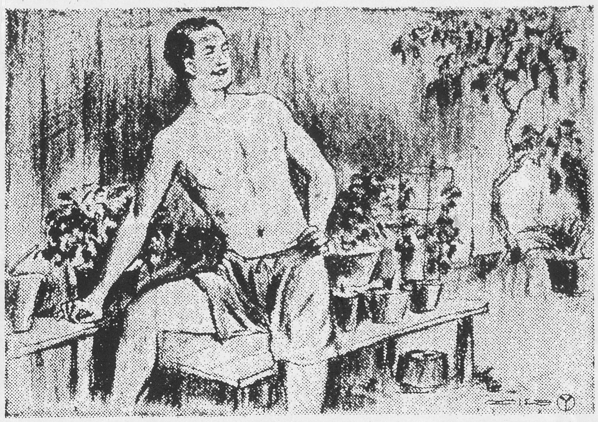 | 説明 | 明治・大正・昭和前期を通じて男性が股間を覆う衣料には、褌(フンドシ)とパンツという、大きなふたつの種別があった。特別な目的以外の一般的な褌は、六尺褌、越中褌、畚(モッコウ)褌の三種。パンツは構造上、二,三種類に分けることもできるが、それぞれの名称には不確かな点もある。男性には褌派とパンツ派とがあって、褌派の人の方が古い日本の男らしく、明治の男といえばほとんどがまだ褌だった、というふうに考える人があるかもしれないが、挿絵の中で見るかぎり、もう1880年代(ほぼ明治10年代)ぐらいでもたいていの男はパンツ系のものを穿き、褌は稀である。この絵は、大戦以前、男性の穿いていたもっともふつうの猿股で、すでにパンツと呼ぶ人が多かったはず。このころになるとデパートでも、ゴム入りの、西洋風のブリーフは安く手に入ったが、大人は紐で結ぶもので、ゴム入りは子ども向き、と考えている家庭もあったようだ。(大丸 弘) |