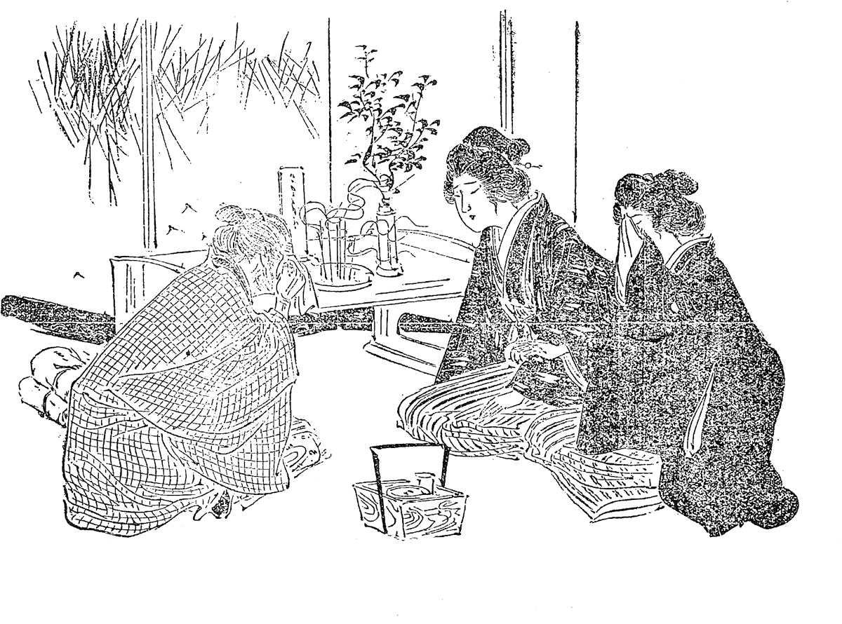 | 説明 | ハンカチーフは維新後わりあい早い時期から、日本人の生活習慣の中に取り入れられているが、今日眼にする文字情報としては、1880年代、1890年代(ほぼ明治10~20年代)の重要輸出品としての記録が多い。日本の絹製ハンカチーフを歓迎したのは米国市場で、それまでの清国製品の独占を大きく侵していった。ただし品質においてはまだ清国製品に劣っているとして、とりわけ染色については研究の余地があるとの指摘を受けている(中外物価新報 1887年1月13日1面)。同じころに絹織物の本場フランスに向けても輸出が試みられ、桐生産の綾織の新型ハンカチーフを送ったところすこぶる好評だったので、三千枚を輸出することになった、など。こうした輸出品としてのハンカチーフはもちろん羽二重などの絹製にかぎられているから、われわれの身近なハンカチの日常性とは少し隔たりがある。この絵で涙を拭いているハンカチは、必ずしも絹製である必要はない。それまでの、襦袢の袖口を引き出して涙を拭く習慣が、ハンカチにとって代わられたさまがわかる。英語の“handkerchif”は文字通り手巾で、ほんらい多目的的であり、その点は手拭いに近いが、フランス語の“mouchoir”は口巾で、口を拭ったり、また鼻水を大きな音を立ててかんだりするイメージが強い。べつに原語の字義にこだわる必要はないが、要するにハンカチはそんな気取った、装飾的用途だけのものでないことはだれでも経験上知っている。しかし仮に鼻をかむためのものにしろ、用便後のお手ふきに使うにしろ、いつも人の目につきやすい存在であるし、またちょっと人に使わせたりもする、という点がハンカチーフの存在態様の難しさだ。(大丸 弘) |