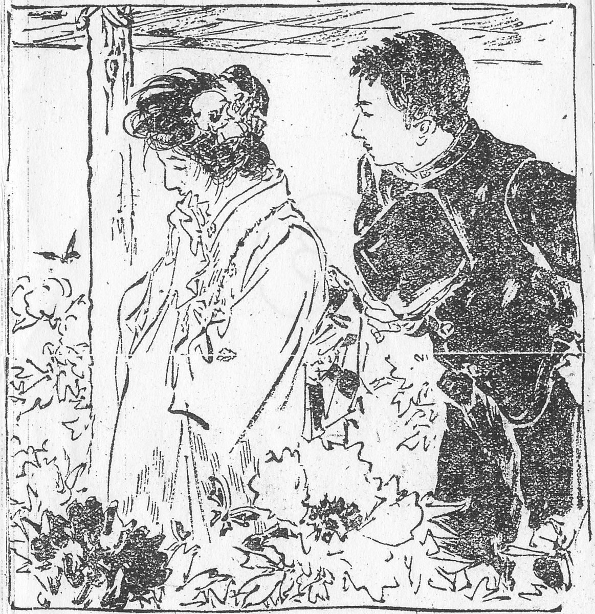 | 身装画像コード | D004:[適齢期の娘;新造;(1) 嫁入り前の娘,新妻,さらに一般の他家の妻女をいう。] D2hi:[束髪(庇髪など、後期平型の)] D1ka:[髪飾り(櫛,簪,リボン)] Vhan:[半襟] D3ob:[帯の締め方;帯の位置] Whan:[ハンカチーフ] D800:[感情・思考・意志の表現一般] D4ga:[学生・生徒(男子中学生以上)] Wbo:[かぶり物一般;帽子] |