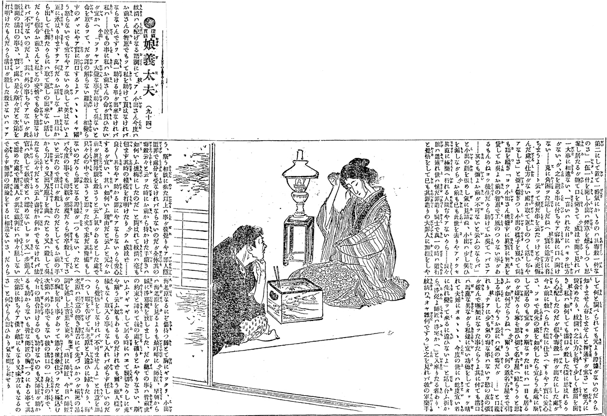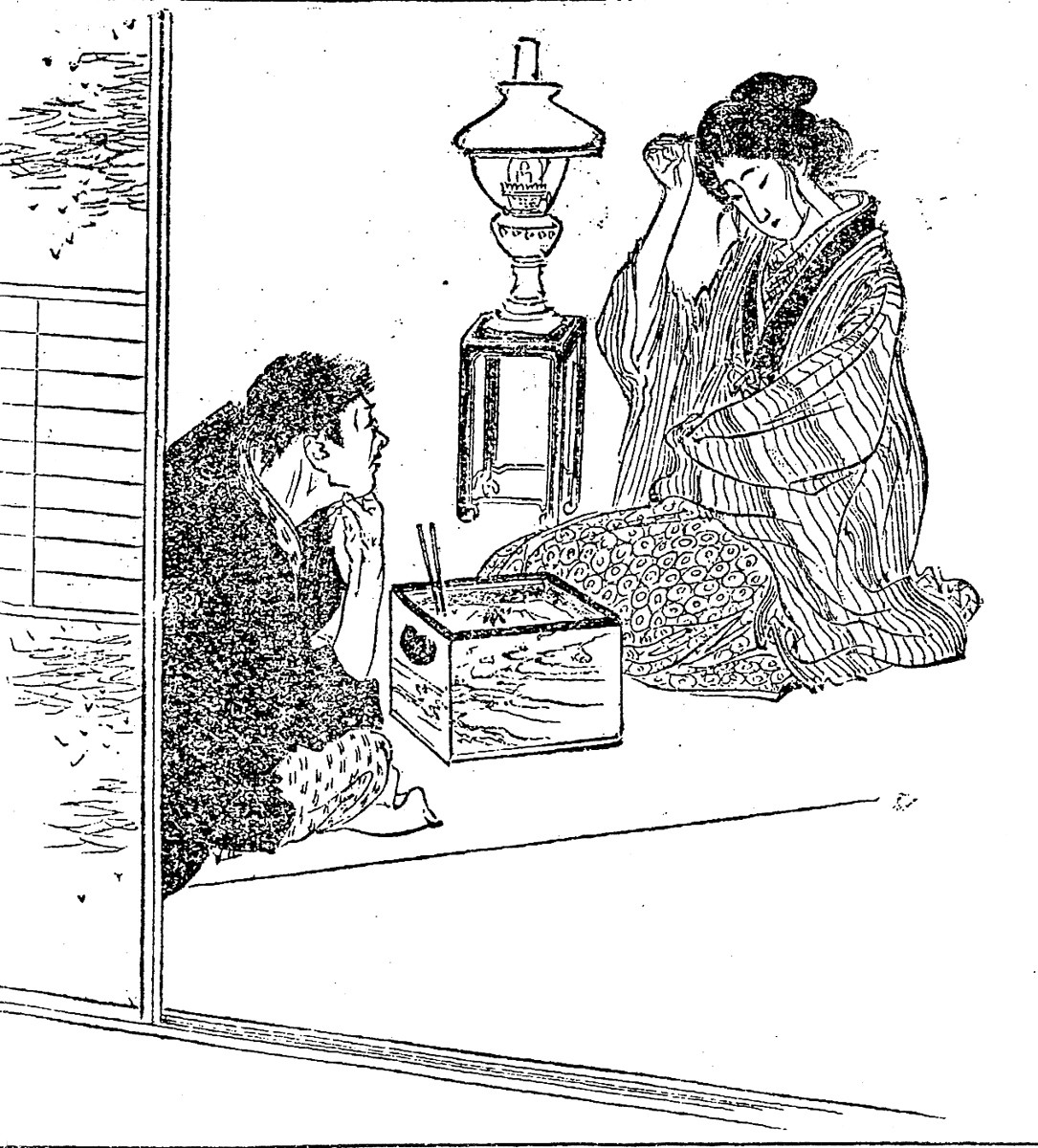 キーワード 娘島田;黒襟;髪に手を遣る;火鉢;ランプ