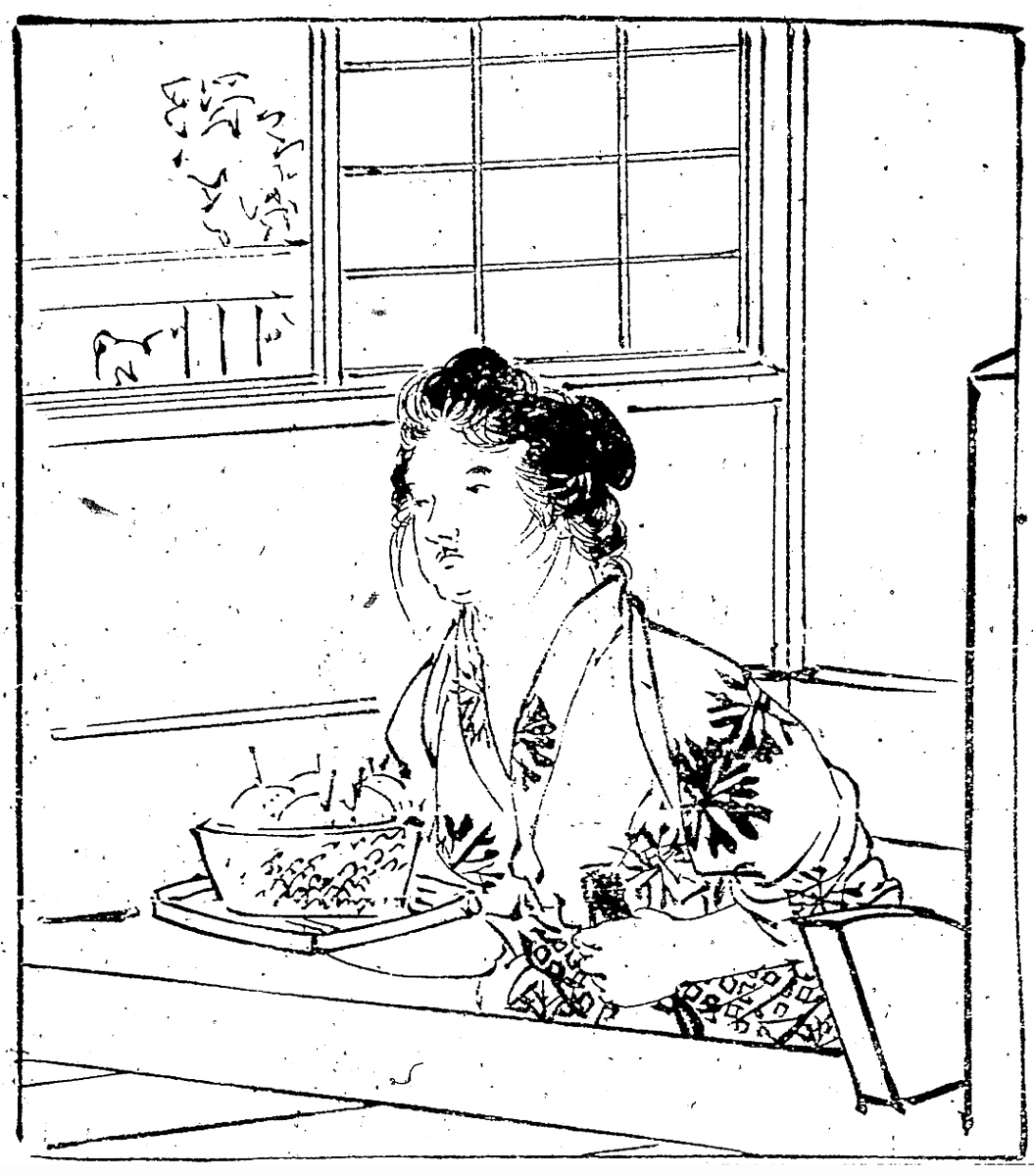 | キーワード | 女中;襷掛け;お盆;鉢;梨;階段 |