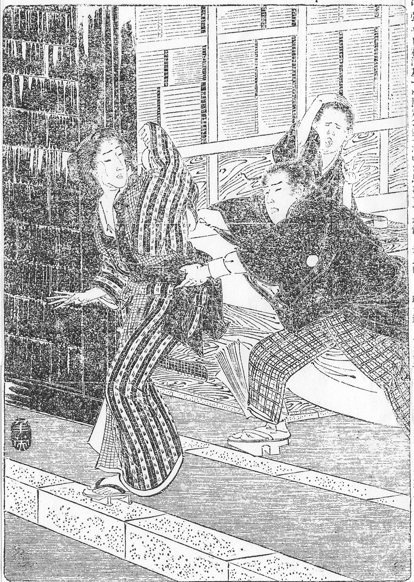 | 説明 | 女の背後から、男がその帯際を掴んで行かせまいとするところ。明治の半ばごろのやや前屈みの姿勢の女が、腰骨の辺に帯を締めると、こうして後ろから帯を引き寄せられ、身もだえするすがたも絵になるようだ。結び方が若い人の特別な飾り結び以外、お太鼓一辺倒になったのは、1910年代(大正初め)に入ってから、と考えられるひとつの根拠は、それ以前の時代を背景にした小説挿絵の中の庶民の女性、とりわけ既婚女性は、ほぼ例外なくひっかけ結びで描かれていることだ。東京下町を商売人の目で体験してきた理容館の遠藤波津子の、明治時代の下町のおかみさんは、大体が家では手軽なひっかけ結びで、裾を曳いている人もまだ多かった(読売新聞 1930/7/26:5)という思い出も、だいじな証言になる。庶民の女性のふだんの帯は長さが二尺ほど短い八尺で、ひっかけ結びの結びあまりの一方は、斜め横に角のように突き出ているのが特色。(大丸 弘) |