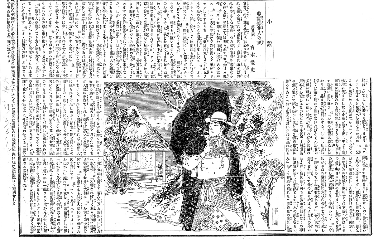 説明 故郷をあとにして旅立つ若者。田口年信の挿絵は、背景の樹木や建物も、人物の描写も、日本画の伝統のままの筆法なので、若者の今風のいでたちが不調和なほどに感じられる。尻を端折った格子縞のきものに、時候はもう秋が深いようなので薩摩絣の書生羽織を重ねている。きものに締めた兵児帯や股引、紺脚絆までは江戸時代の姿だが、鍔(ツバ)に波を打たせた丸帽、首巻、詰め襟の白シャツ、それに四角い革鞄と蝙蝠傘が文明のしるし。帰れるかどうかもわからない旅立ちにしては荷物が少ない。それは、ひとつにはこの時代のその日暮らしの日本人は、四季を通じて着替えの衣類を、ないと言ってもよいくらい持っていなかったため、またそれでこと足りたため。(大丸 弘)