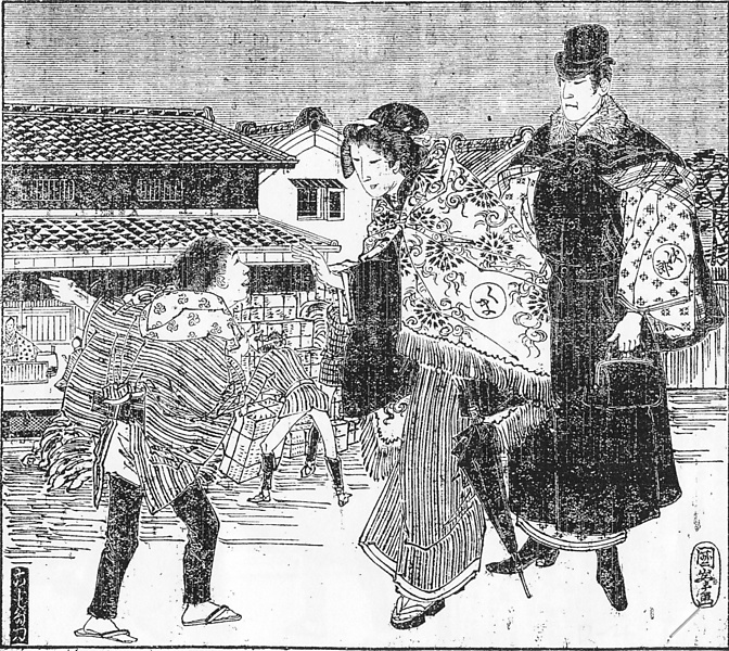 説明 この日の本文とは関係のない挿絵。上京した夫婦者が通りすがりの、使いの小僧さんらしい子どもに道を聞いている。男の身なりを見れば、提げている革鞄にしっかり札束の入っているような身分であることが想像される。黒の高帽に海獺(ラッコ)皮の襟が付いた裾長の二重外套、革靴を履いて、刷りが消えかかっているが鞄と一緒にステッキを持つ。女の丸髷はまだ三十代の女性の結う大きさ、肩からショールを掛けているのはコートが流行する以前、ほぼ明治10年代(1880年代)の風習だった。表付き、塗りのノメリの下駄を履き、裾の厚いきものを重ねているのもけっこうな身分の奥様風。(大丸 弘)