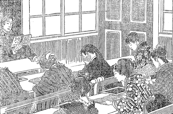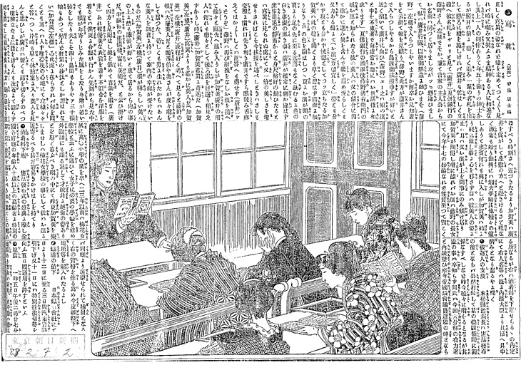 | 説明 | ヒロインの学ぶ梅花女学校の授業情景で英語の時間らしい。ここに描かれている生徒は不完全にしか見えないのを含めても七人にすぎないが、一人以外は和服。髪型のわかるのは六人で日本髪と束髪が半々。束髪は上げ巻風が二人と、マーガレイト風が洋装の一人。日本髪は前列左が結綿(ユイワタ)風、二列目の真ん中の娘は赭熊(シャグマ)のように大きな髷を付けているが、はっきりとはわからない。もちろん赭熊ではない。娘たちはけっこう襟を抜き、いかにも下町娘風で、こんな女学生の風俗は、明治も前半のごく初期の女学生にかぎられる。(大丸 弘) |