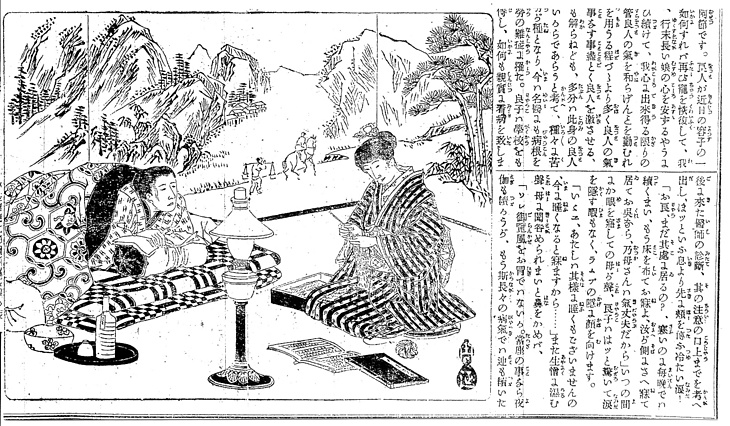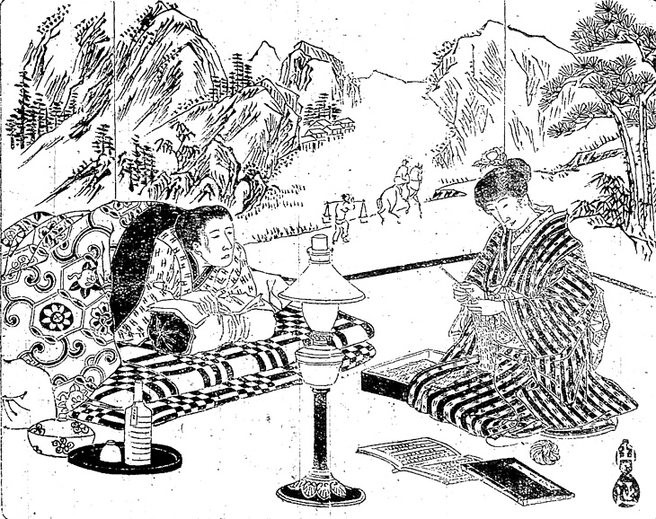 | キーワード | 掻い巻き(かいまき);黒ビロードの布団襟カバー;括り枕;つくね髪;上げ巻;編物;かぎ針編み;毛糸玉;薬瓶;飲み薬;ランプ;和綴じの本;六曲屏風 |