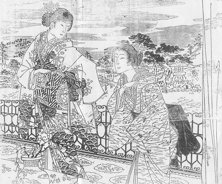 | 説明 | 額の上の髪を短く切って簾(スダレ)のように前に垂らすことを切前髪(キリマエガミ)という。切前髪は髪のスタイルの一部分で、小さな部分だから、さまざまなヘアスタイルと組合わされていつの時代にもある。しかし本式の日本髪と組み合わされている例はごく少ない。切前髪が多く見られるようになったのは、1885(明治18)年頃にはじまった束髪、とくに西洋風束髪と組み合わさってのこと。この絵に見るように、1880年代(ほぼ明治10年代)後半の西洋束髪ブームでは、推奨された何種類かのスタイル――イギリス巻、フランス巻、揚巻、マーガレットなどの眼目は大体背面から頭頂にかけての髷の取りようであって、とくに前髪についての言及はないようだ。そのためかその時代、新聞小説挿絵に登場する若い束髪の女性に、切前髪がかなりの比率で認められる。前髪を短く切って前に垂らす髪型は西洋ではめずらしくない。当然日本娘の切前髪もそれをまねたにちがいない。髪を前に垂らす理由は、広すぎる額や面長な顔を嫌っての場合もある。女賊三日月お仙のように、向こう傷を隠す目的もあった。前髪を垂らした顔には、人によっては幼さや、また一種の愛嬌の出るものらしく、英米ではこのスタイルを“kiss me quickly”などと呼ぶ。この絵に描かれているのは1887(明治20)年頃、華族と見まがうような暮らしをしている家の十四,五歳の娘。「緑の黒髪は軽やかに束ねて、牡丹の造り花一輪をさしはさみ、房々としたる前髪を切り下げたるは一段愛らしき風情あり」とあり、切り前髪が顔の美しさを際立てる効果を強調している。(大丸 弘) |